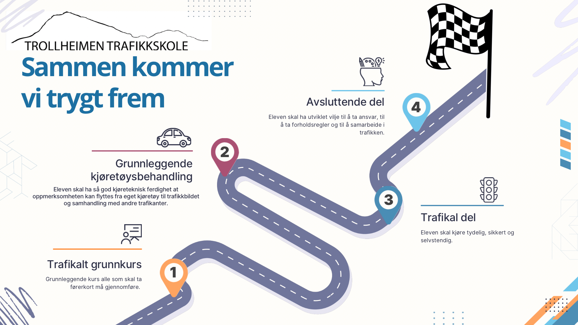 - Alle trinnene i føreropplæringen har mål som skal være nådd ved slutten av trinnet. Derfor vil det være nødvendig med kjøretimer utenom disse obligatoriske delene. Et eksempel på dette er at man kan ikke si seg ferdig med trinn 3 (trafikal del) uten at man har kjørt i bymiljø. Og for å oppnå dette målet må vi bevege oss utenfor Surnadal, derfor foregår store deler av opplæringen på Sunndalsøra og i Kristiansund for eksempel